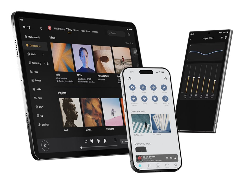 T8 podporuje různé vysoce kvalitní audioformáty, včetně DSD, PCM, FLAC, APE a WAV, s podporou až DSD512 a PCM 768kHz/32bit, čímž zajišťuje profesionální zvuk ve studiové kvalitě.