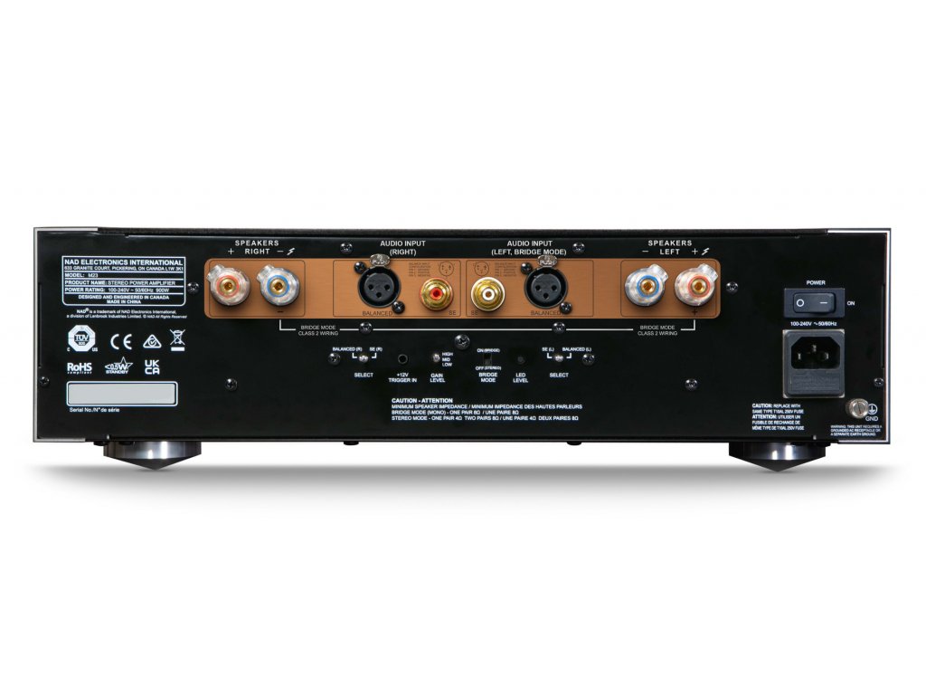 Stereo výkonový zesilovač NAD Masters M23 lze snadno integrovat do high-end sestav díky vybavení nesymetrickými RCA a symetrickými XLR vstupy s funkcí autodetekce signálu, třístupňovému nastavení zisku a vstupu pro 12 V trigger. M23 může pracovat také v můstkovém režimu, kdy dodává 700 W trvalého výkonu do 8 ohmů. Dva zesilovače M23 v můstkovém režimu lze spárovat dohromady nebo lze M23 zkombinovat s oceňovaným BluOS streamovacím zesilovačem NAD Masters M33, přepnutým do můstkového režimu, čímž vznikne špičková sestava s trvalým výkonem 2 x 700 W.
